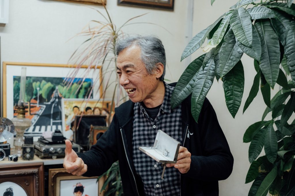 店舗の中ほどにはソファーが置かれたリラックスできる空間があり、年代物のカメラが並べられていました。動かないものも多いそうですが、取材に同行していたカメラマンは興味津々。マグネシウムに着火して撮影するタイプなど、普段はお目にかかれない珍しいカメラを見せていただきました。