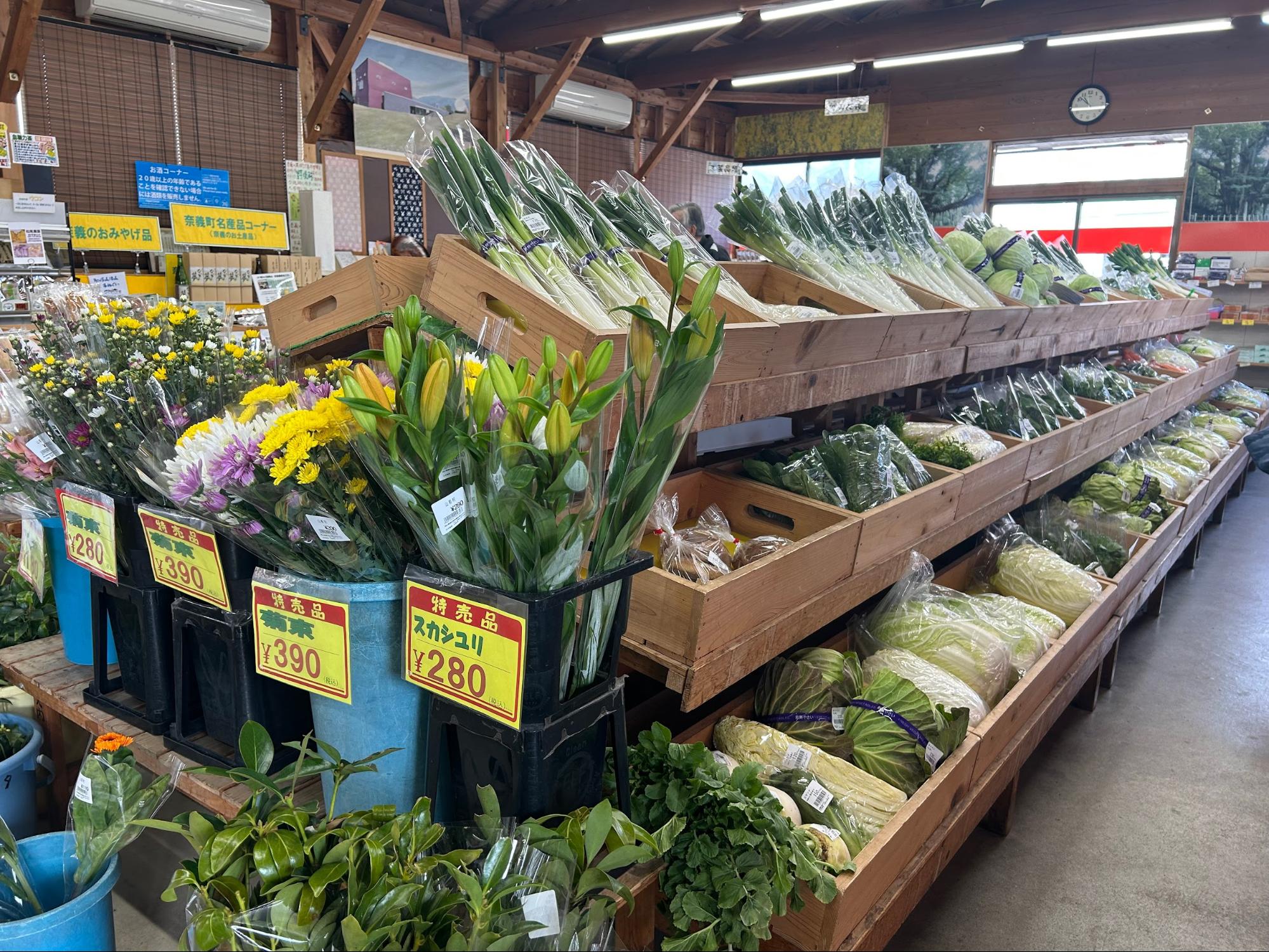 棚の中には、新鮮で美味しそうな奈義町特産の野菜や、手作りのお菓子などがぎっしりと並んでいます。